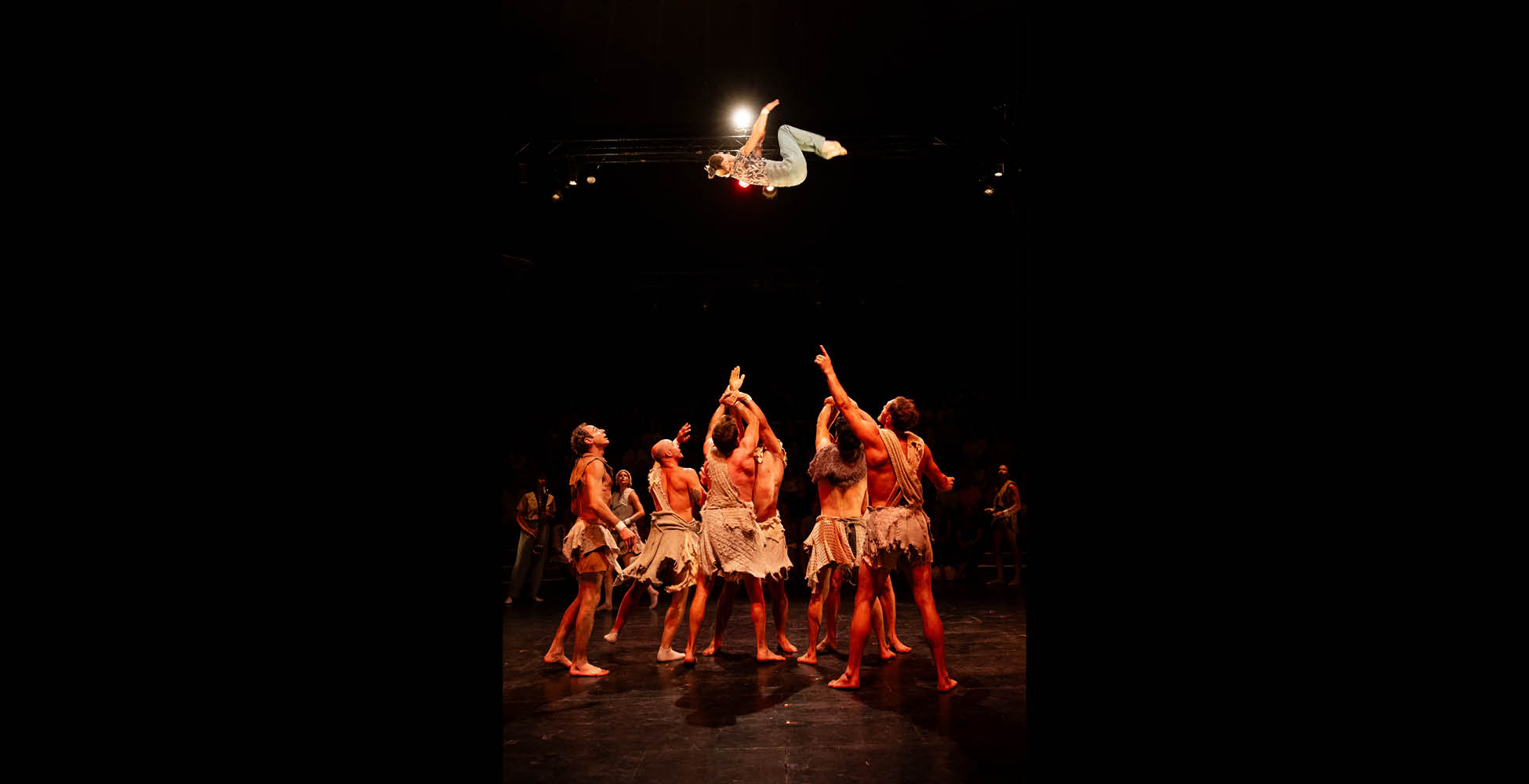 En italien, ostinato signifie l’obstination. En musique, c’est un motif qui se répète inlassablement, avec de légères variations. Ce terme résume bien notre propos. Le spectacle raconte, en 1h10, une grande fresque de l’humanité, de la préhistoire jusqu’au voyage sur la Lune. L’être humain avance, recommence, chute, se relève, invente, persévère. Cette idée de répétition et de transformation permanente traverse toute la création. Avec Alexandre Markoff, notre metteur en scène venu du théâtre, nous avons voulu une narration simple et universelle, capable d’embarquer tous les publics, sans discours appuyé, uniquement par la force des corps et de la musique.