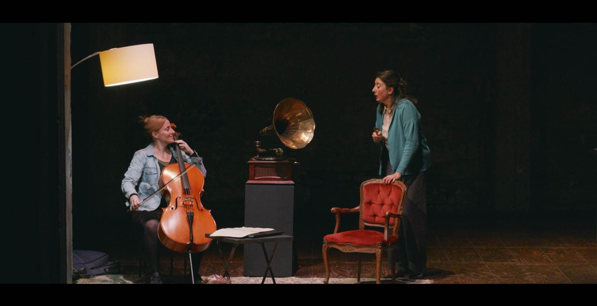 “Madame – histoire chantée des femmes qui m’ont précédée » a une forme un peu hybride, le fil narratif est un dialogue entre deux personnages : Régine, environ quatre-vingt-dix ans et sa petite fille Bénédicte, la quarantaine, violoncelliste. Bénédicte arrive chez sa grand-mère qui lui prépare un repas et des discussions naissent : les questions de la petite-fille à sa grand-mère, et les réponses qu’elle veut plus ou moins lui apporter, mais surtout ce qu’elle cache. Il y a également des flash-backs dans la vie de Régine, ce que ces discussions font ressurgir des souvenirs de sa vie de jeune femme, et certains moments telles des parenthèses, de l’ordre du philosophique ou du poétique, ainsi que beaucoup de chansons. La musique est très présente, Véronika Soboljevski, ma partenaire sur scène joue du violoncelle et nous chantons toutes les deux ! Celine Baudino a également réalisé un travail sonore merveilleux, et une création lumière évocatrice, poétique et précise a été faite par Michèle Milivojevic.