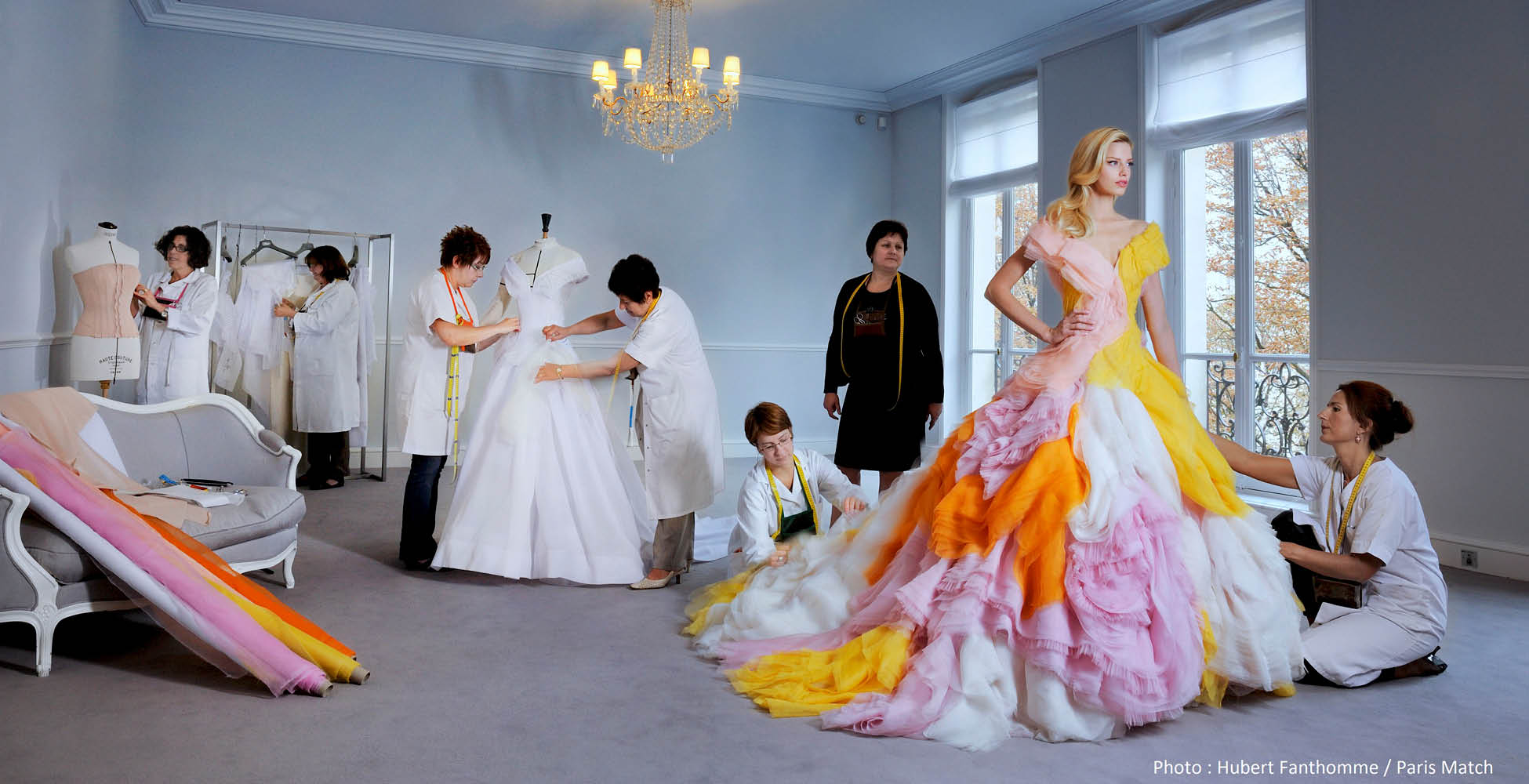 J’ai organisé cette exposition en plusieurs sections permettant de découvrir comment Paris Match a pu traiter la mode dans ses colonnes au fil des décennies. On commence par les portraits des grandes figures. De Christian Dior – le premier à faire la couverture en 1950 – à Jean-Paul Gaultier en passant par Jacques Fath, Gabrielle Chanel, Yves Saint Laurent, Hubert de Givenchy, Mary Quant, André Courrèges, Pierre Cardin, Karl Lagerfeld, Kenzo, Christian Lacroix, Gianni Versace, Thierry Mugler,… Puis nous évoquons les coulisses des grandes maisons avec le travail des studios et des ateliers. Cette démarche est d’ailleurs très particulière. Montrer le travail des ouvrières, du geste précis, de la main à l’œuvre, n’était pas dans l’ADN de la grande presse de mode. Là, Match innove encore. L’exposition se poursuit avec les évolutions majeures de la mode depuis le New Look des 50’s. Défile sous nos yeux la révolution de la mini-jupe et de la liberté de la femme, le mouvement hippie, la mondialisation du secteur et le phénomène des supermodels. Enfin, un hommage est rendu aux égéries de la mode – d’Audrey Hepburn avec Givenchy à Catherine Deneuve pour Yves Saint Laurent – et aux liens de celles-ci avec le monde de l’art.