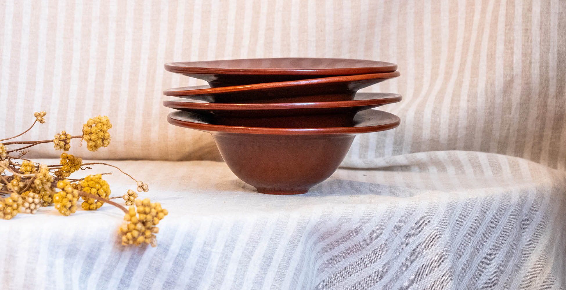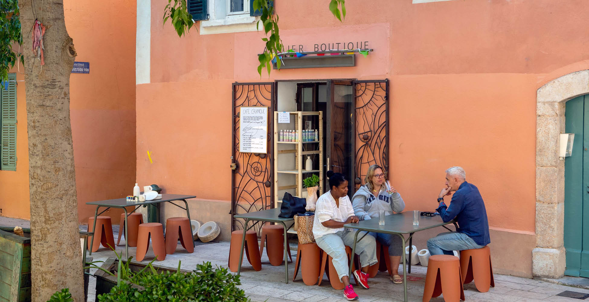 cuisson et une boisson. On peut s’installer en terrasse sous les micocouliers, jusqu’à quinze personnes, ou en intérieur, jusqu’à huit. Les pièces sont émaillées pour être alimentaires et fonctionnelles : on peut les utiliser chez soi, les offrir, les collectionner. Je propose aussi des cours : des initiations au tournage, une technique exigeante qui permet de comprendre comment monter une pièce ; et des ateliers de modelage, où l’on réalise des objets du quotidien grâce à différentes techniques. Les pièces sont décorées à l’engobe, puis je les cuis et les émaille avant qu’on puisse les récupérer.